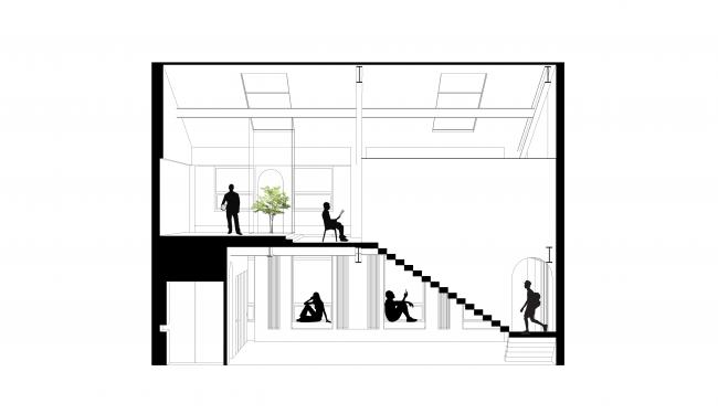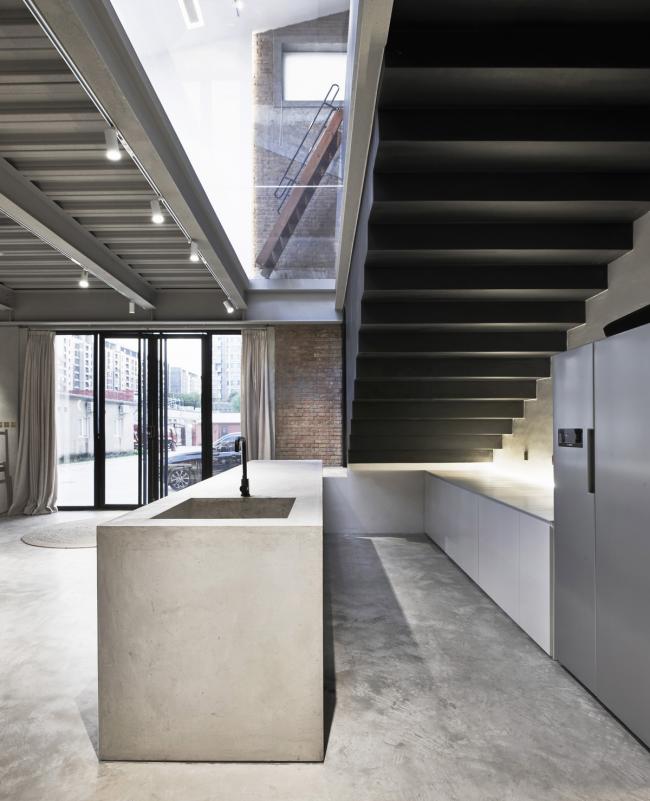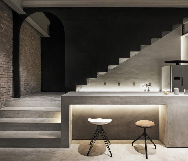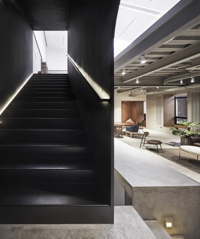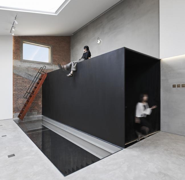 在空间一二层的连接部分插入了一个近 6 米高的巨大黑色楼梯盒子,并刻意露出了盒子底部由楼梯踏步形成的锯齿图形,与下面的混凝土吧台及台阶形成很好的视觉呼应。雕塑般的黑色盒子的介入增强了一层空间的戏剧感,并预示着由一层步入二层即将到来的空间节奏的变化。