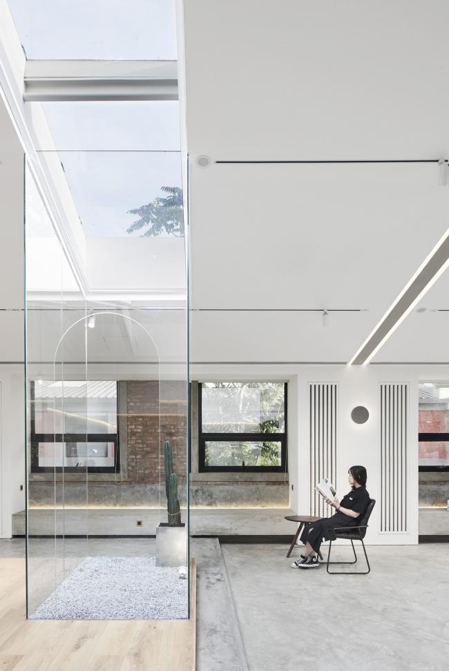 在天窗下置入了一个“玻璃盒子”,盒子内部铺满了户外庭院的碎石,在室内空间中打造出了一个具有户外体验的玻璃庭院。