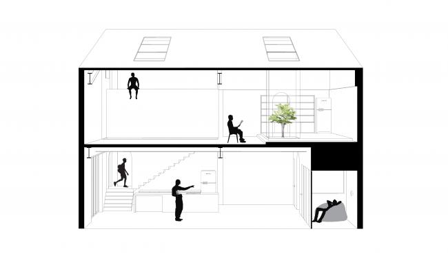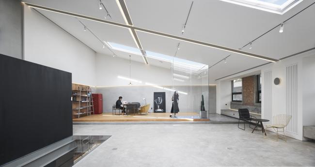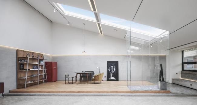 二层局部地面被改造为钢化玻璃楼板,透明的材质对于常规的一二层空间分隔起到了缓冲的作用,虽然身在不同的界面,但能感知到彼此,创造出具有暧昧感的共享空间关系。