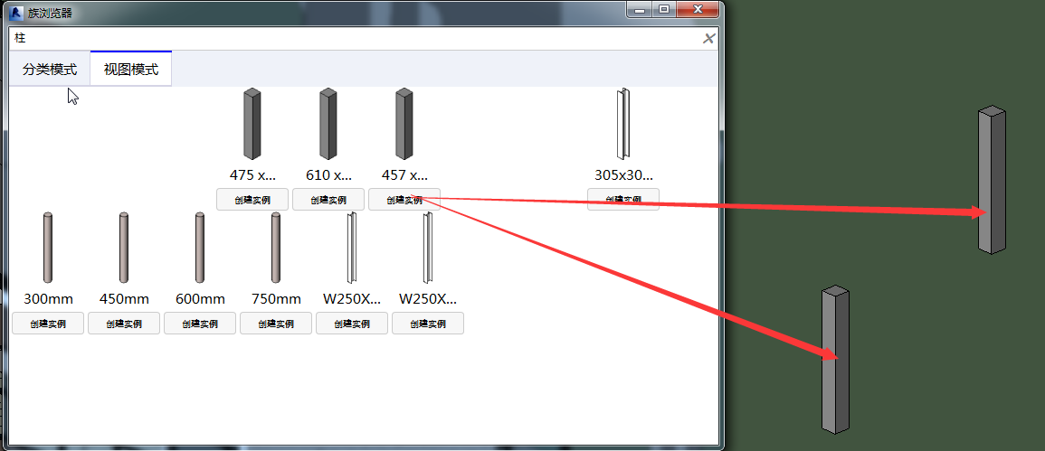 在弹出的族浏览器对话框中,可在视图模式中输入族名关键字显示当前项目中对应的族快速预览图。