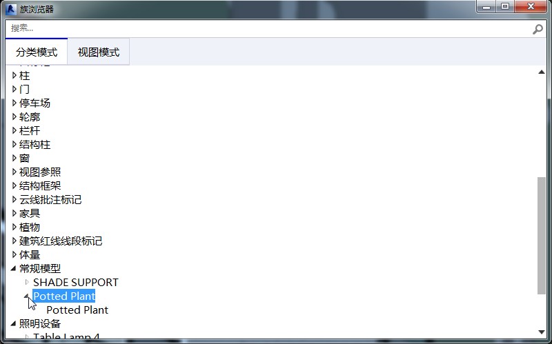 在分类模式栏目中,可以树列表的形式展示当前项目中的族对象。