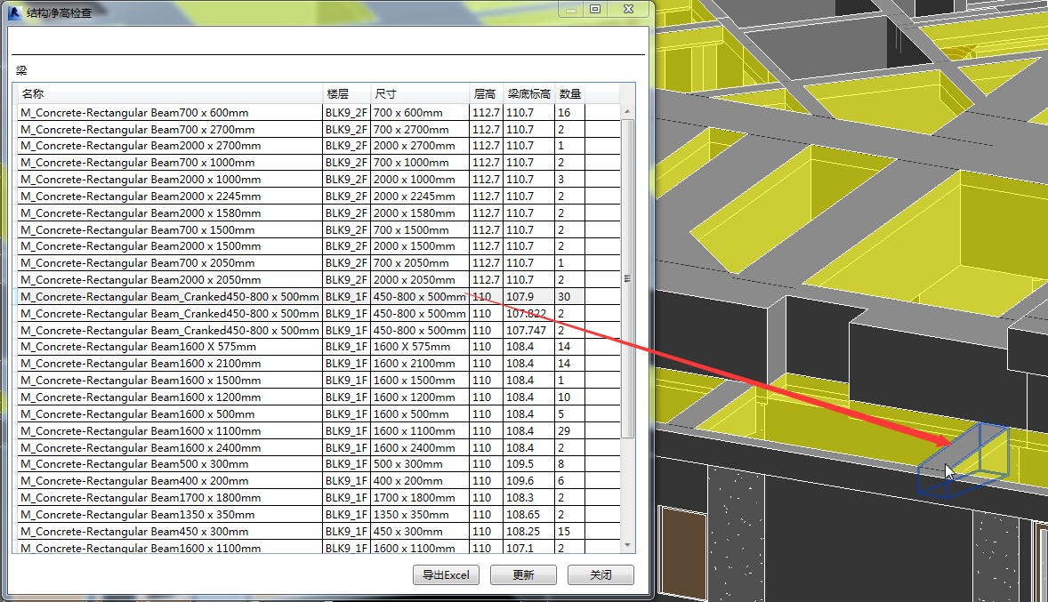 在弹出的”结构净高检查”对话框中,将显示当前项目中所有的梁单元。在列表中选取对应的对象后,所选单元将在视图中定位并高亮显示。