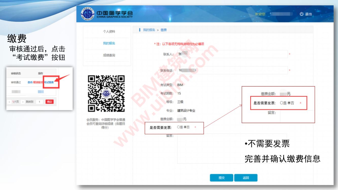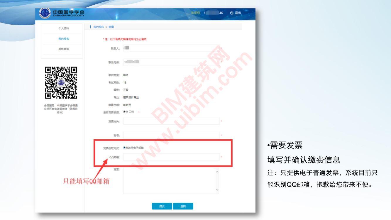 - 填写并确认缴费信息 注:只提供电子普通发票,系统目前只 能识别QQ邮箱,抱歉给您带来不便。