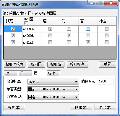 在弹出的”isBIM 快模-墙快速创建”对话框中,设定墙、门、窗的标高和类型,拾取墙、门、窗的图层,点击”创建”按钮,如下图所示。