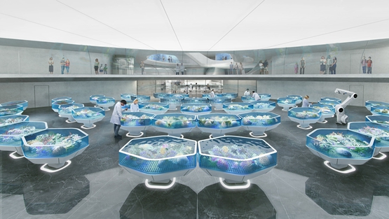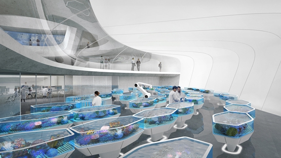 这个四层建筑的入口广场,将是一个开放的圆形空间,水族馆陈列在可见的上层。