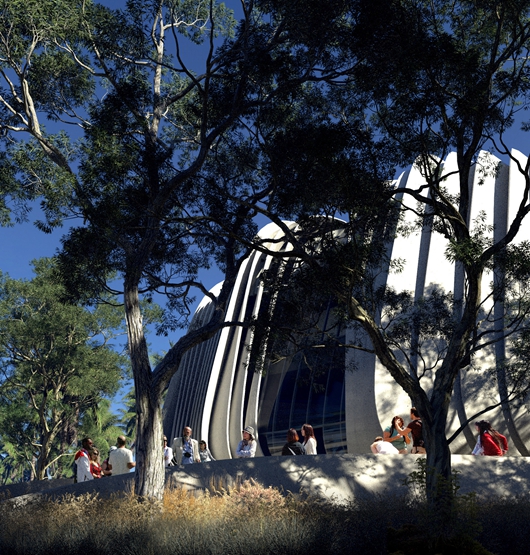 这个项目的结构表现为一系列垂直重叠的混凝土板,以曲线形式向上和围绕生物库的侧面和顶部延伸。