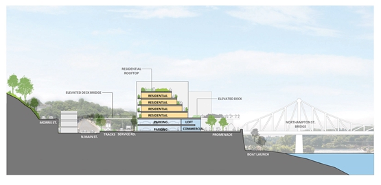 这个混合用途开发项目的图纸显示,它将包括沿河的一系列建筑。这些建筑将是带有屋顶花园、停车场和商业空间的住宅,由高架人行桥连接。