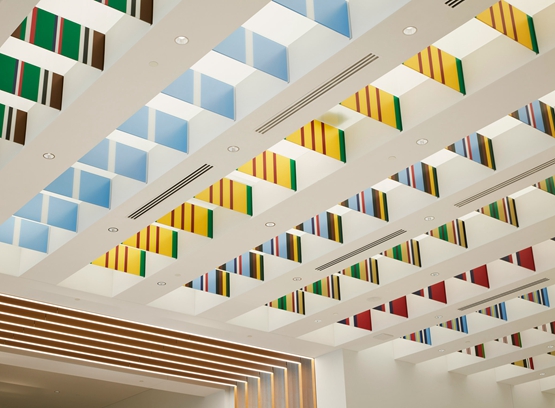 大堂上方的白色花格天花板也被用作活动空间,上面装饰着22排半透明夹层玻璃板,颜色与陆军战役彩带相配。