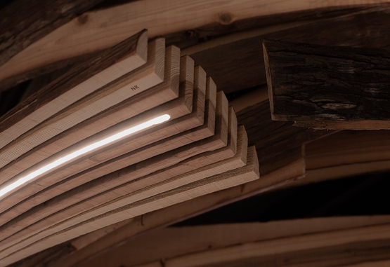 当面板被带到“余烬餐厅”现场后,郭随意安排它们向顺时针方向,以创造最终的漩涡状结构。一根雪松梁被部分嵌入餐厅的一根结构柱中,作为客人休息喝饮料的柜台。