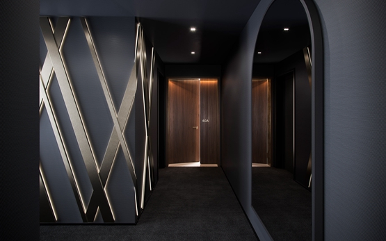 入口走廊将覆盖一个青铜交叉标志,这是阿斯顿马丁品牌的标志,将覆盖黑暗的阿贾耶设计的墙纸。阿斯顿马丁的设计团队将在墙上悬挂一个大拱形的烟熏玻璃镜子,作为摩天大楼拱形窗户的参照物。