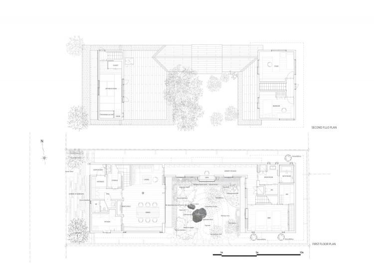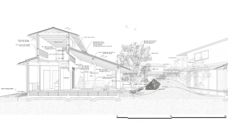由于场地被其它房屋所包围,中村拓志& NAP事务所在面向街道的立面设计了封闭的竖向木隔栅。同时,在住宅中央,一处户外庭院成为了房屋的焦点——为每个房间引入了自然景观和光线。在庭院中,用房屋打地基时挖出的泥土堆出了一座土丘。用这一新的地形故意遮挡了餐厅和场地后侧卧室之间的视线。餐厅和卧室之间通过一条图书走廊相连,走廊里的书桌对着花园。