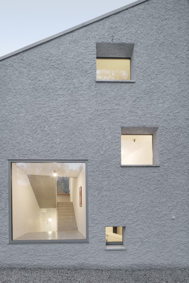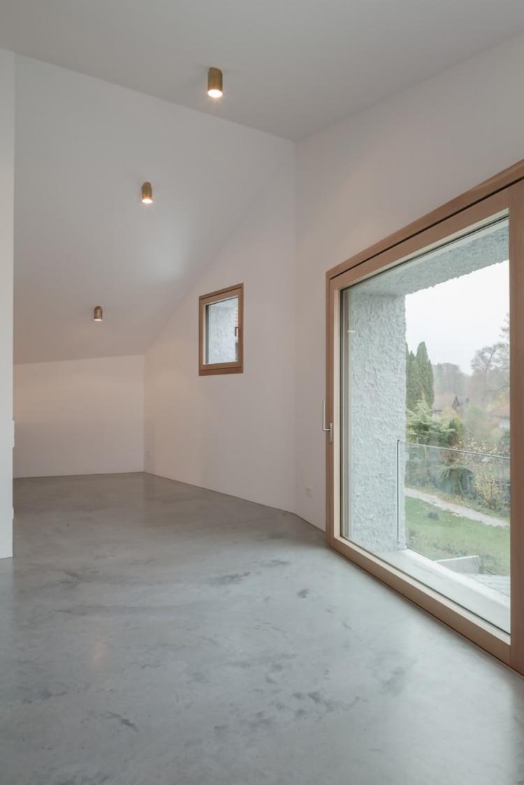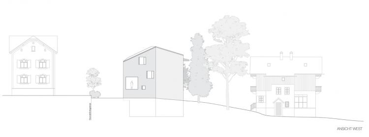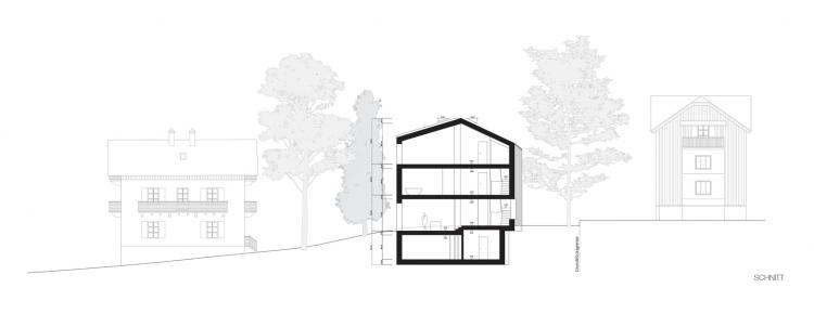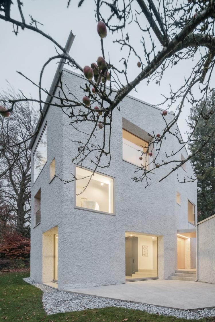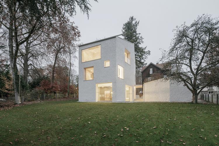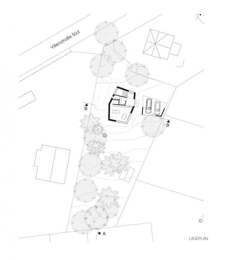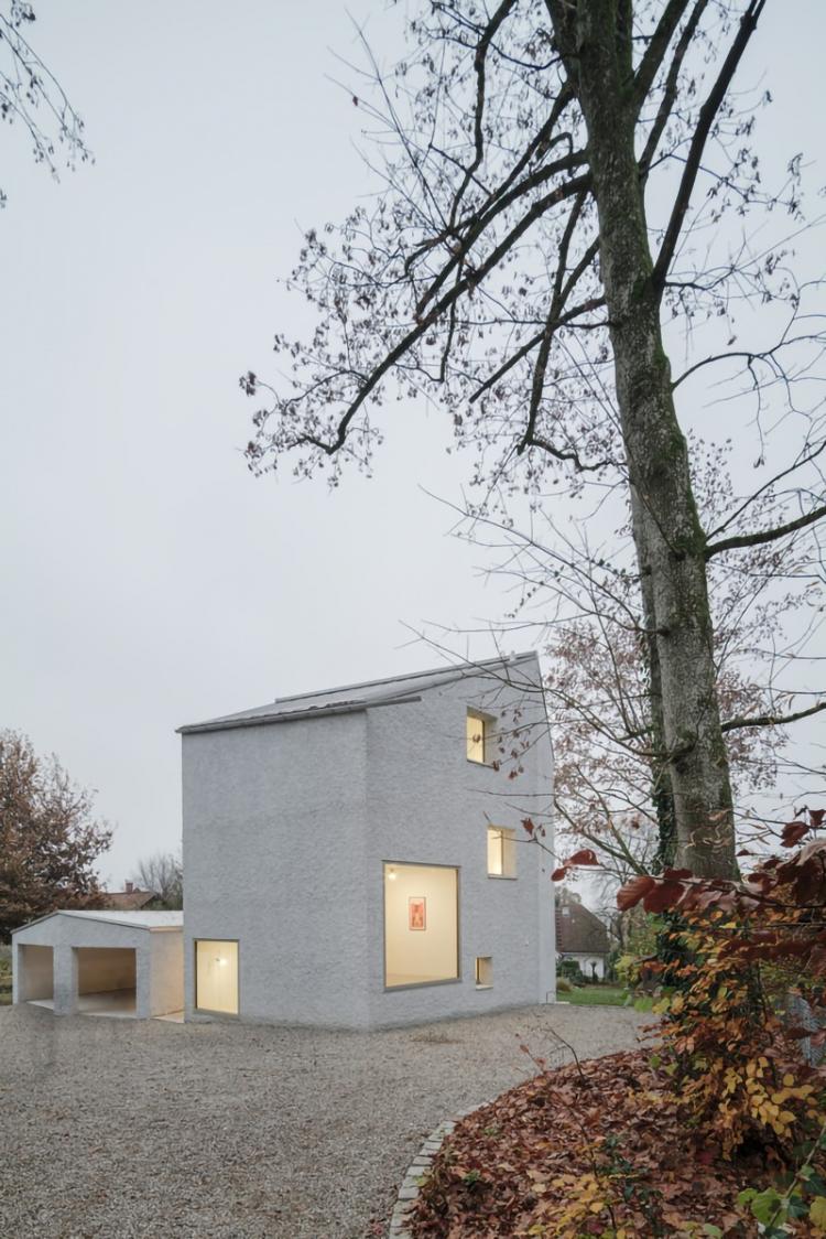 考虑到周围古树众多,同时要兼顾阿默尔湖畔和安德希斯修道院的景观视野,该建筑的体量和邻近的建筑一样,像塔一样拔地而起。为了增加这种高度感,设计了三层楼,顶层有一个客厅。通过一扇大窗户可以透过树梢看到阿默尔湖、安德希斯修道院和阿尔卑斯山。厨房作为家庭日常生活的中心,与一层的花园相连。