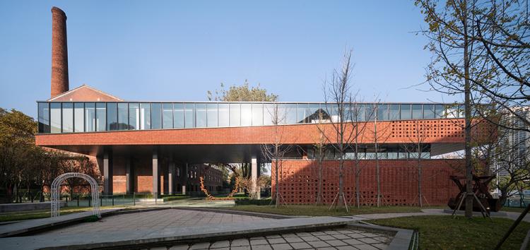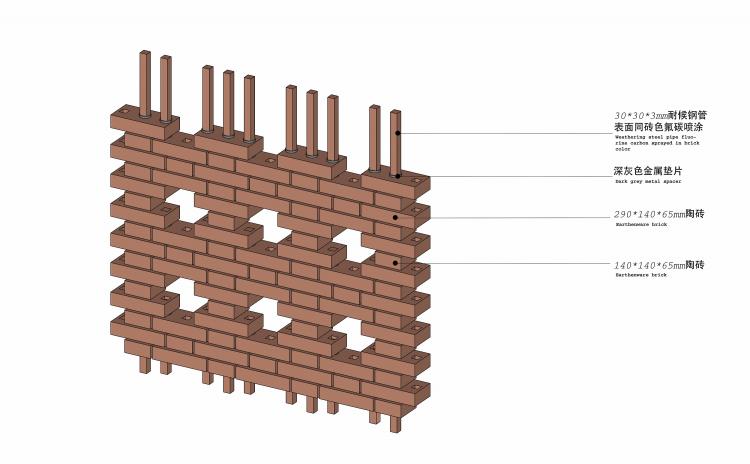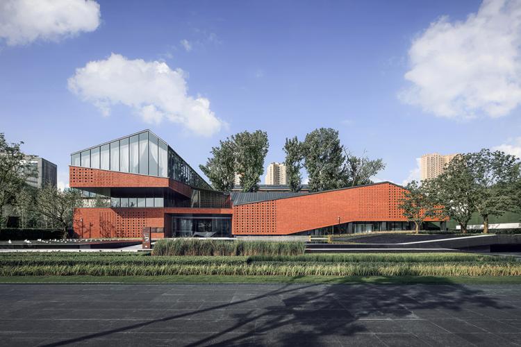 项目创新设计了十字花纹的砖花图案。十字花纹来源于厂区内部唯一一座一级保护建筑、转炉车间的外立面砖墙图案。转炉车间具有较高的建筑美学价值,由我国著名建筑学家张良皋设计。原砖墙图案为菱形,且为砖墙砌筑而成。而本项目为陶砖干挂幕墙系统,通过长短不一内部龙骨布置,最终形成特殊的十字花纹。为呼应东侧张之洞博物馆张扬的造型,砖墙也如帷幕一样,轻挂悬起……10万砖只采用了4种基本模数,组织成三种不同的图案,随着第五立面起伏,形成全新的建筑语汇。