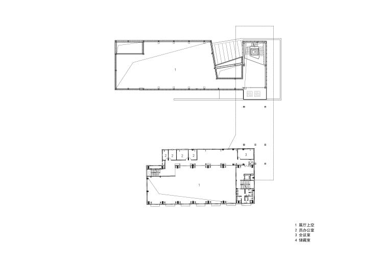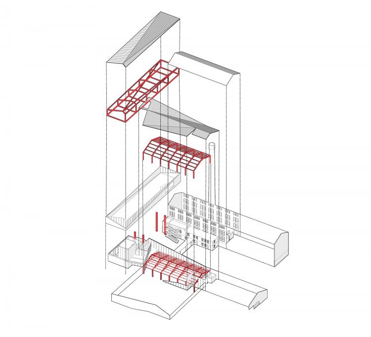 从与原有建筑空间和结构的对话开始,挖掘置入的新功能空间的主题特征,在自身合理组织的同时也时刻跟原有结构体系产生碰撞与磨合。两座保留建筑之间增加的矩形结构,使它们在空中伸展直至交汇,最终形成一个公共庭院。这种介入方式不仅构建了一个新的楼层,还为建筑赋予了一个具有凝聚力的中央区域,人们可以在这里散步、停歇或举办集市和表演活动。