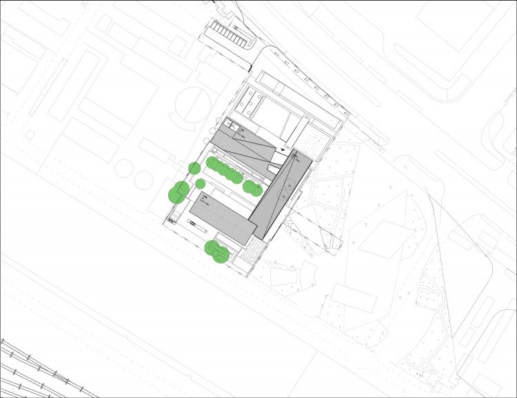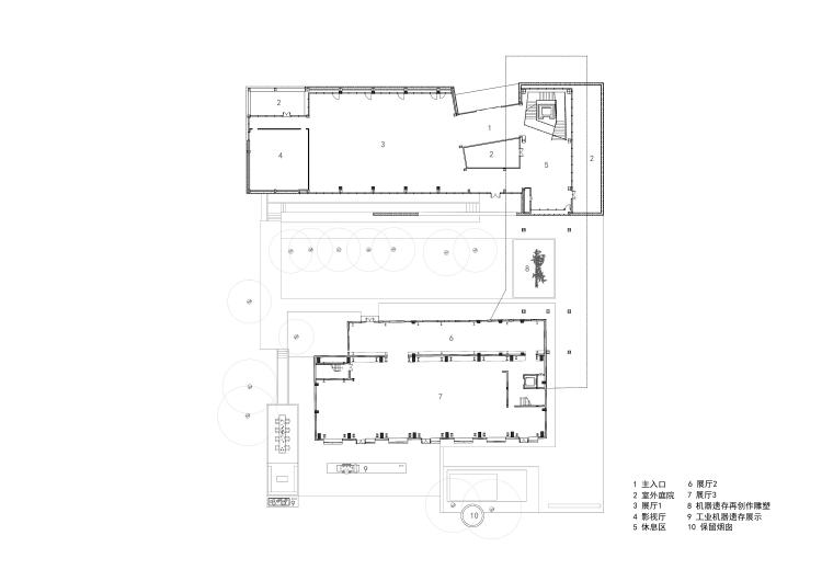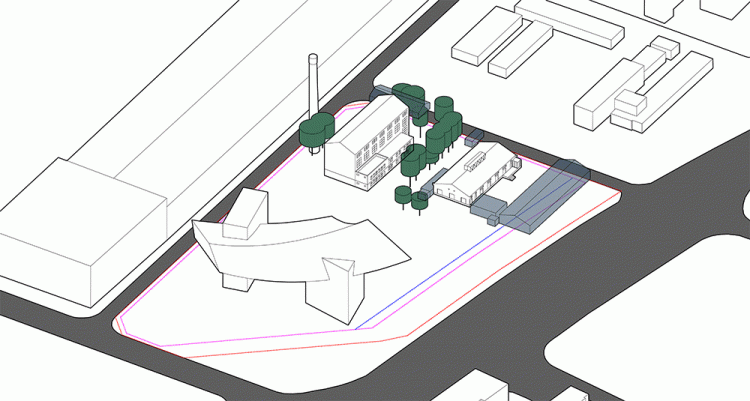 通过多次现场调研,实际测绘老厂房和保留树木的定位。设计将2000年以后建造的不具有遗产身份的建筑拆除,场地内直径超过50cm的树木原地保留,未超过50cm的树木则就近移植,场地内的烟囱也被完整的保留下来。