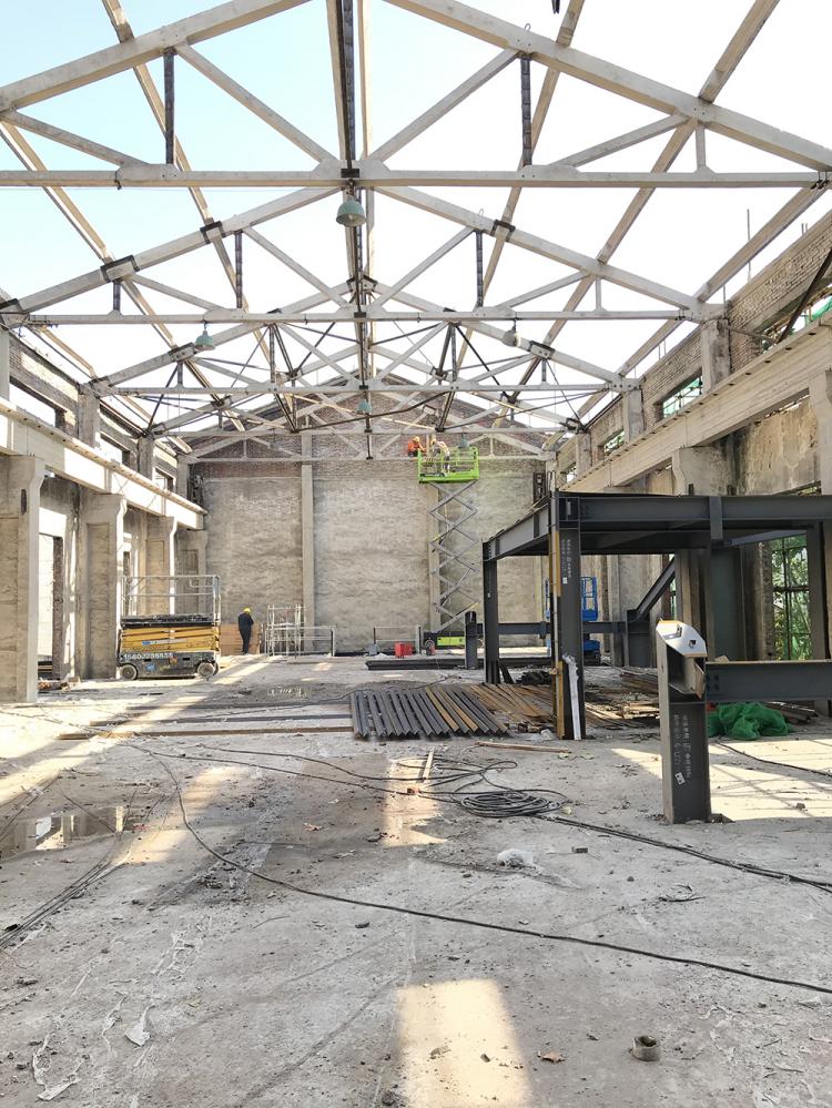 业主笑谈修缮一栋建筑比新建十栋建筑更难。建筑内操作空间有限,一次只能进一台车来清除陈年工业流水线设备基础;通过一系列的基础重建工程,完善建筑防水保温;对老旧结构、墙体进行加固来承接新的功能;新建的结构与主体结构脱开,增加新的楼层,最后实现传统厂房转变成现代公建;为满足新的使用功能的消防、排烟、节能灯要求,原屋顶被拆除,更换成全新的金属屋面。