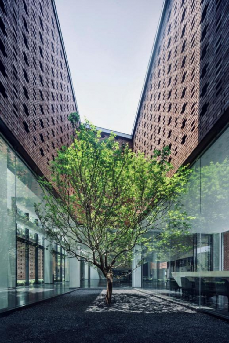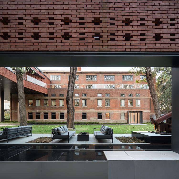 在三级保护建筑内部,设计置入一些开敞庭院:完全内置型庭院,改善内部环境的采光通风环境;靠外侧半开敞型,则通过陶砖幕墙的围挡形成较私密的共享空间。这些庭院的置入,不仅让前期展览功能的参观流线带来了空间丰富性,也会将来共享办公的功能提供更好的空间特色。