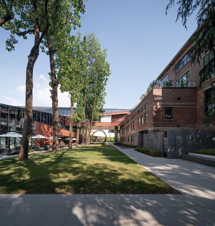 进入内部庭院,就能感受到二级保护建筑的立面完整的被保留下来,原本高矮不一的耳房,通过技术修缮形成完整的屋顶,与空中连廊相连形成一处休憩的屋顶露台。站在庭院中央,一侧是反应新时代特征的建筑,一侧是承载着情感与使命的“旧厂房”,生长了50年的树木依然陪伴在侧。