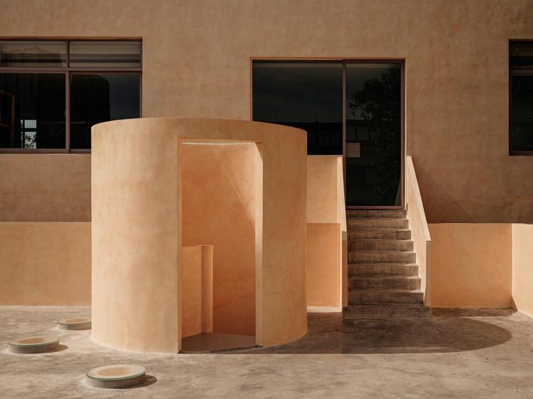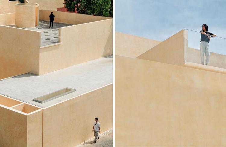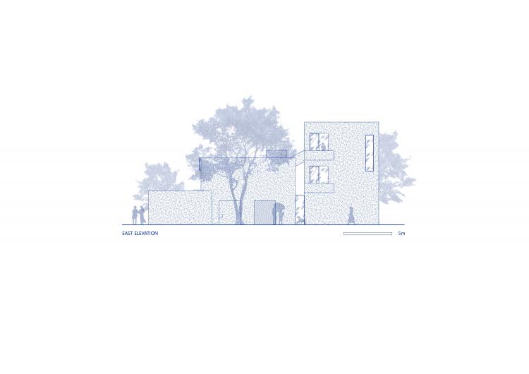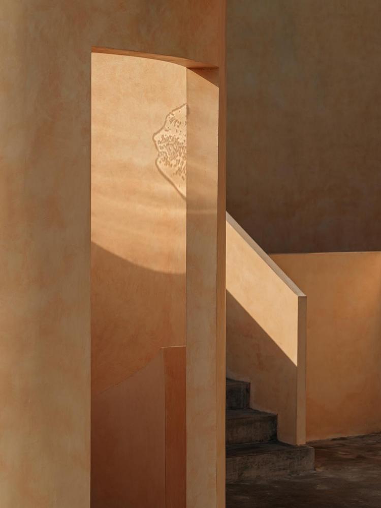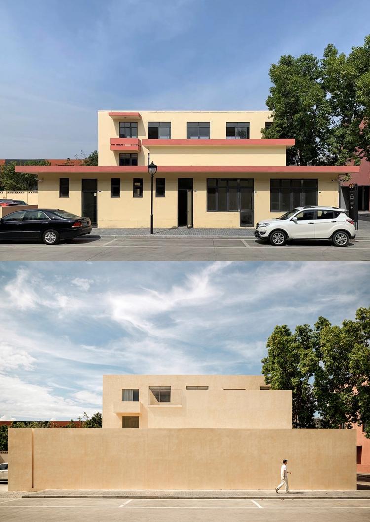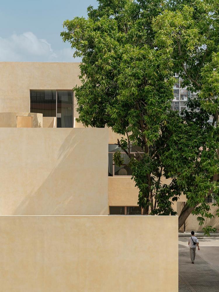 随后,我们对建筑外部进行整理与简化,将部分体量做实。建筑外部使用了与内部相同的檀黄色涂料,特殊的墙面肌理由工人师傅手工反复涂抹形成,原本立面语言相异的三栋建筑由此和谐交融。远眺而望,一棵高大繁密的玉兰树占据了视觉中心,建筑形体在树冠的掩映下消隐了边缘,变得隐忍克制,似有还无。