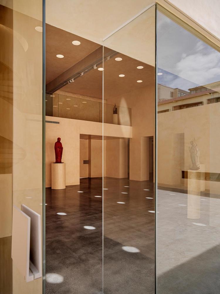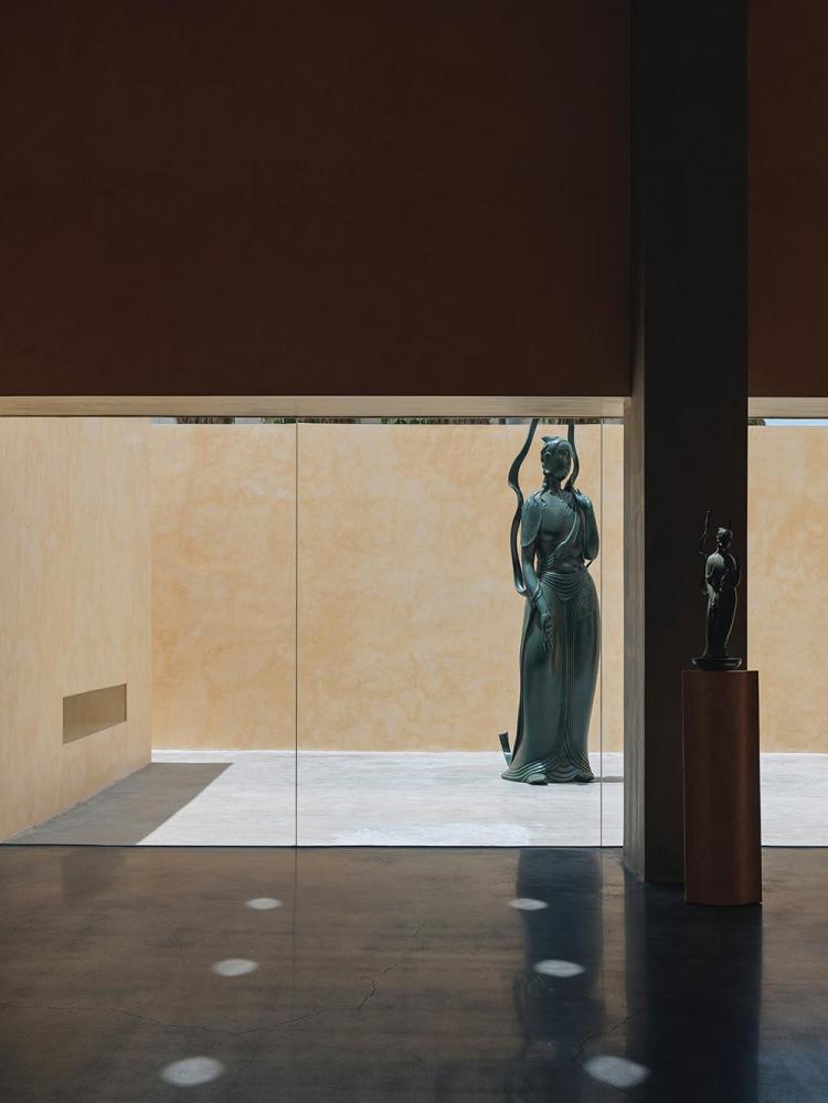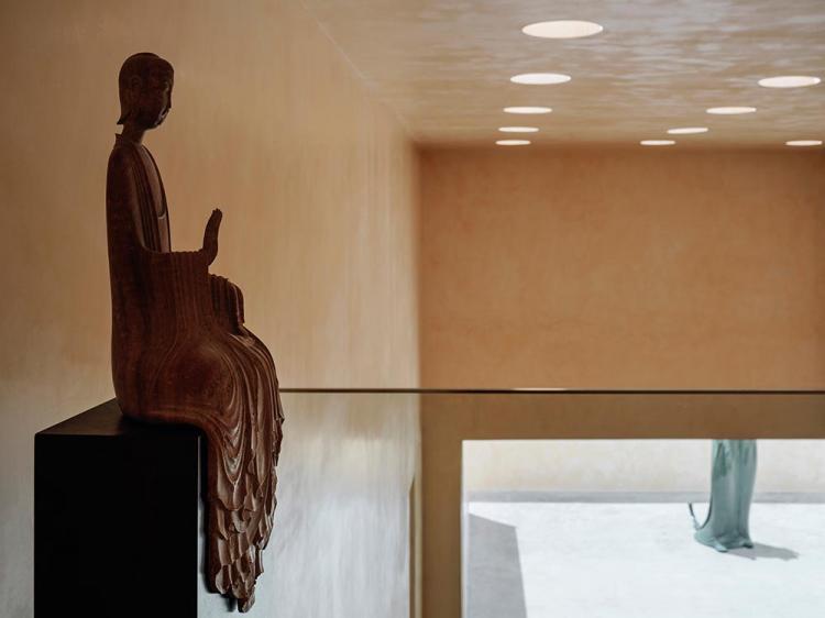 主厅南侧相连的一层空间则是暗室。我们在暗室顶部开设了两个大小不一的方形天窗,并在一侧墙面低处开设了一个长条窗。相较主厅,暗室中的光线更为散漫朦胧,展陈其中的佛像使用了琉璃、玉石等较通透材质,当光影从罅隙中淡淡散落,佛像的边缘随之虚化,有时会产生“虹化”的禅境。