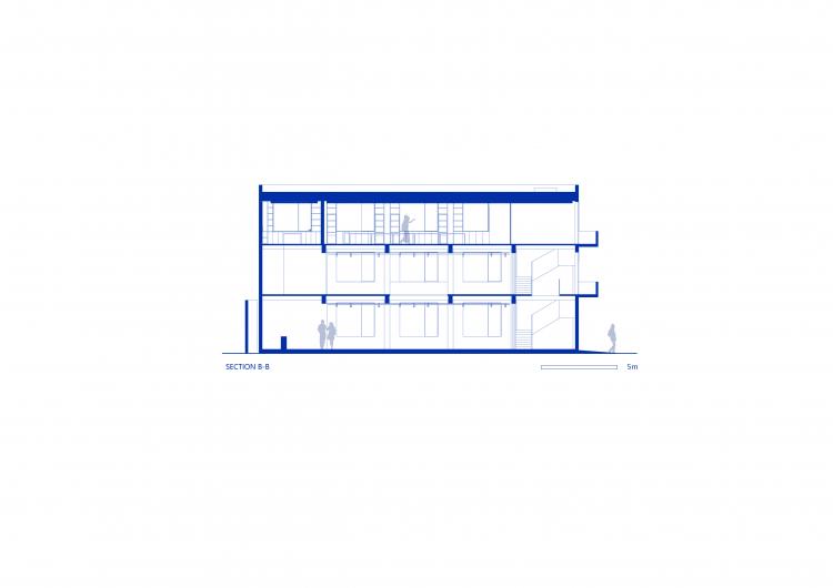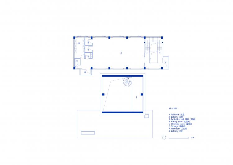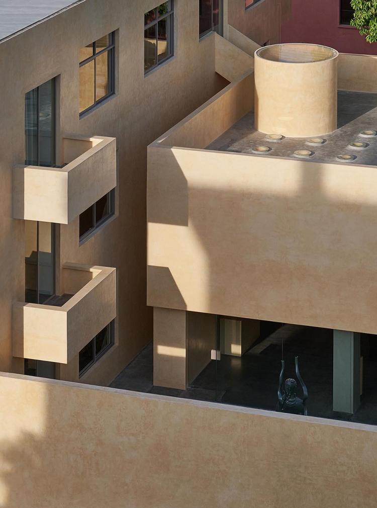 露台的一角新设了一段室外直梯,用以连接2号楼和3号楼办公区。为了提升办公区的空间感和通透感,我们拆除了原本厚重的电梯井墙体,并在楼梯间顶部增设了天窗。从垂直的、光影变幻的楼梯间拾级而下,便可到达办公楼一、二层的时装展厅和工作坊。