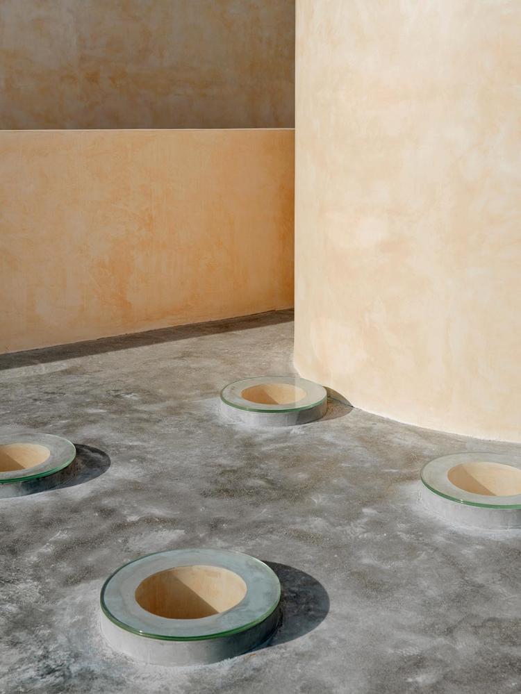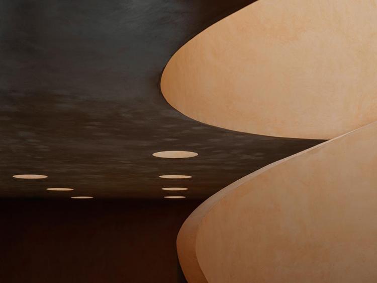 在玉兰树的引导下,参观者绕过墙体,通过树下的旋转门进入展厅,到达一个较低矮的玄关接待空间,再跟随阵列圆形天窗形成的“光雨”,进入两层通高展厅。
