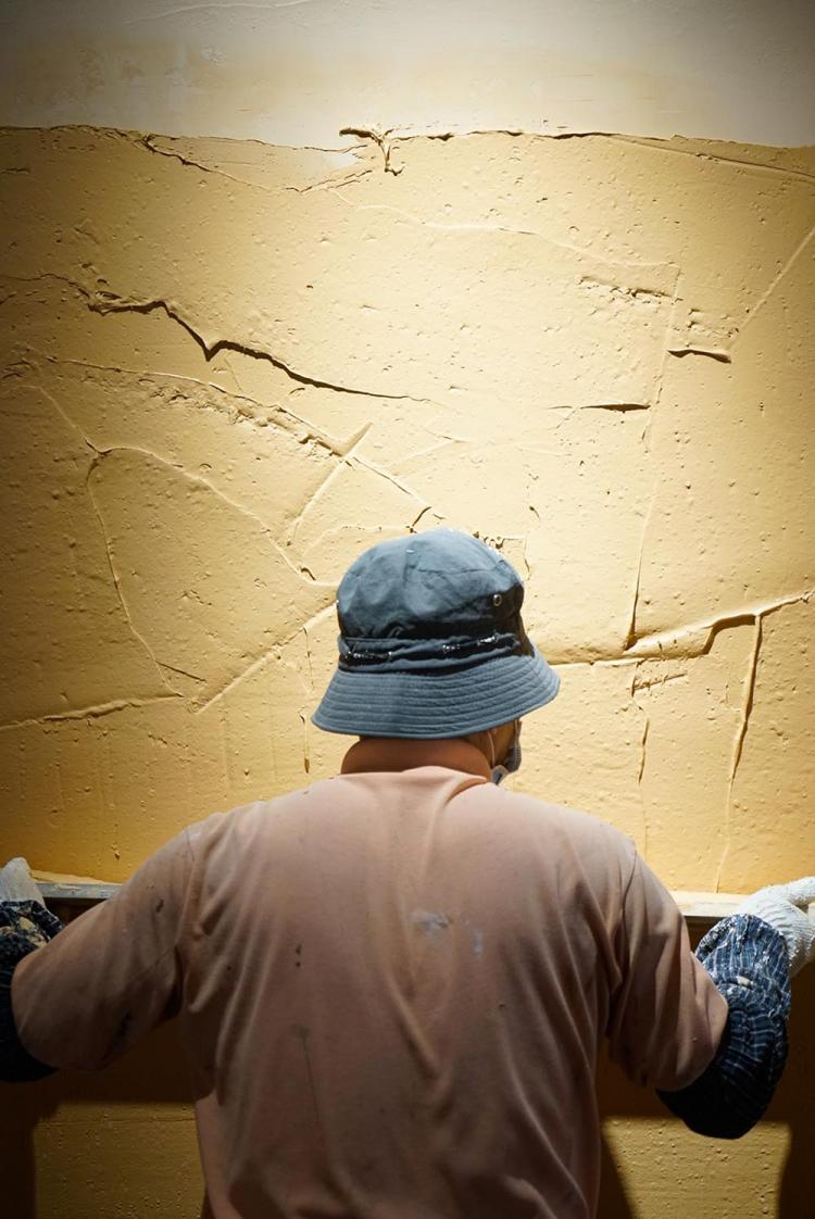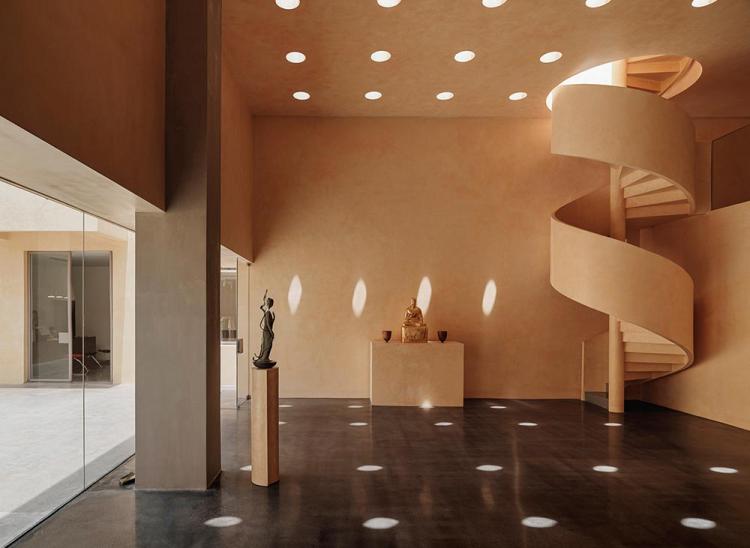 例如建筑外立面及佛像展厅室内(天花、墙面等大部分空间)均采用了一款肌理涂料,这款涂料在当地没有合适的供应商。为了保证最终效果,业主方、施工方与我们一起在场地上进行了反复试验和打样 ,最终所有室外及室内墙面的特殊肌理皆由工人师傅手工反复涂抹出来。完成后的肌理效果,使原本相对各自独立、立面语言不统一的三栋建筑重新获得了整体性和识别度。稍显遗憾的是,原本可以让具象光线及佛像更加凸显出来的天地墙一体的展厅,由于工期的原因,地面部分改成了与办公室统一的深灰色金刚砂地坪。