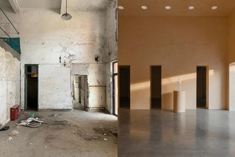 根据“佛的居所”的建筑概念,我们的改造也由内而外展开。首先我们封堵了1、2号楼外立面的窗口,并打通了1号楼的内部墙体,由此得到一个相对整体化的“暗室”,营造出一种向内、封闭的空间氛围。在展厅内部,我们运用大量留白和一体化背景,将部件细节自然隐去,让佛像的自有形态愈加凸显。