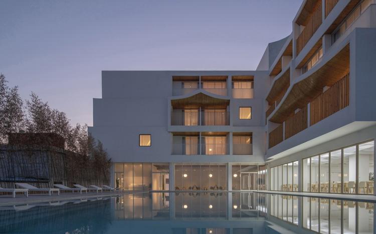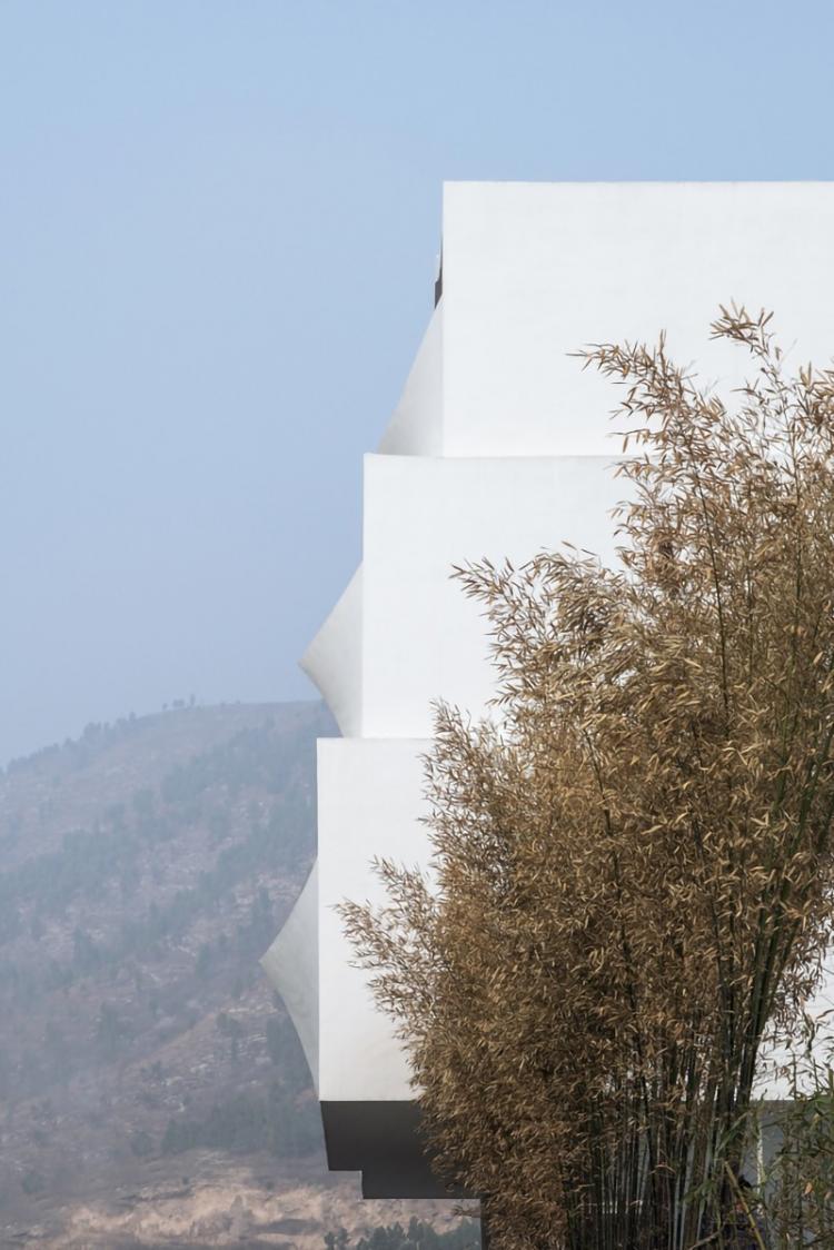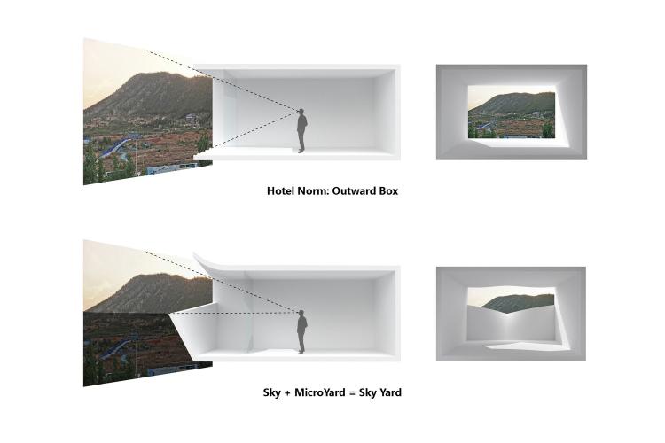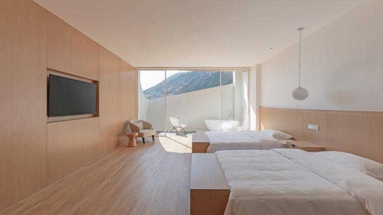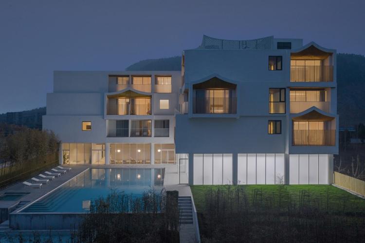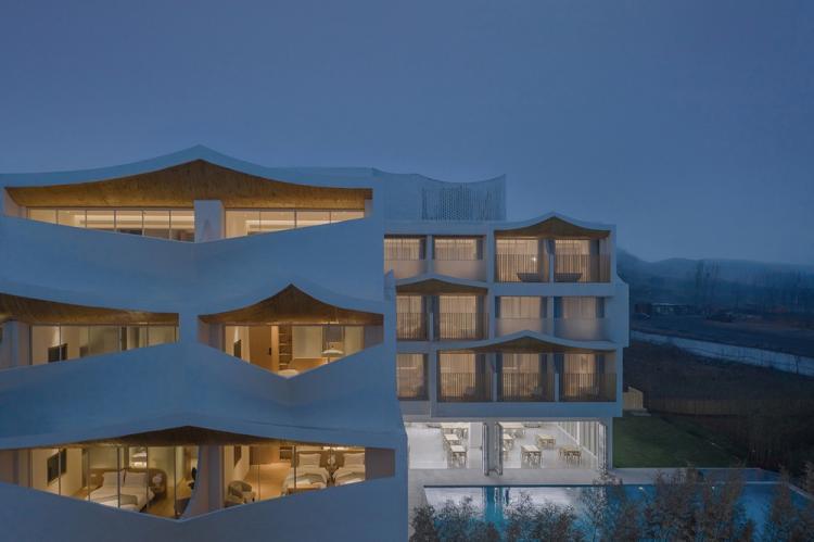 酒店位于云台山景区附近,被工业用地、烂尾小区和破败民房包围的杂乱小环境,对于景区酒店是致命的弱点,幸而场地中依然可以遥望云台山。酒店包含48个多样的房间、独立营业的餐厅、宴会厅、游泳池、地下车库,以及为二期建设预留的空间。怎样在这样的场域中扬长避短,在极其紧张的空间、预算和时间内,兼容复杂多样的功能、营造独一无二的高品质空间体验,是本项目面临的一系列挑战。