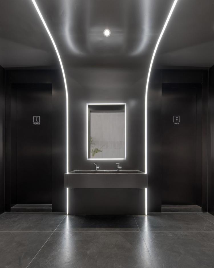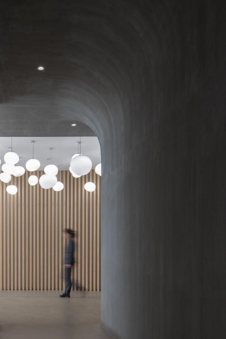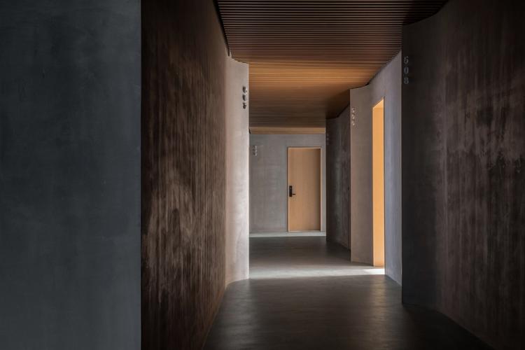 “掀”的手法延伸至酒店的方方面面:在首层公共区域,半弧形的连续空间仿佛从墙面掀起,成为客人的主要行走流线;在客房层,墙面掀起成为房间号码标识;餐厅的引导台和房间内的抽屉拉手,也由“掀”而产生。