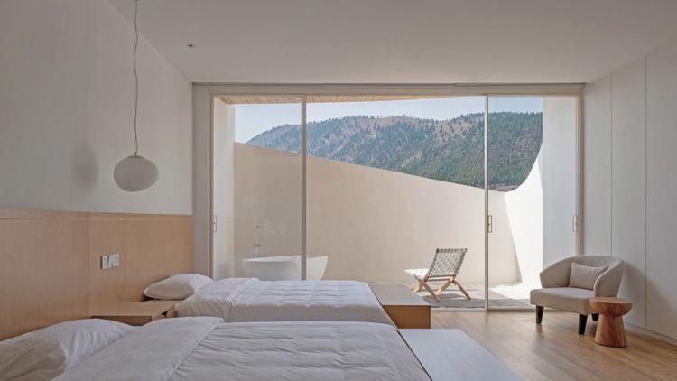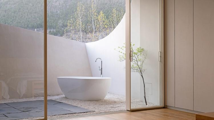 我们回到“客人在房间内的体验”这个原点重新构思,颠覆了这种常规范式:首先将房间对外视线以下的部分全部遮挡,然后将视线以上的开口“掀起”,引进更多的阳光、天空和山景;落地玻璃拉门模糊了室内外的界限,营造出私享的微型庭院。室内与内院在视觉上完全贯通,将客人的注意力引向画卷一样展开的开口。从日出到日落,阳光与弧形的墙面在不同的角度都会产生不同的光影效果。