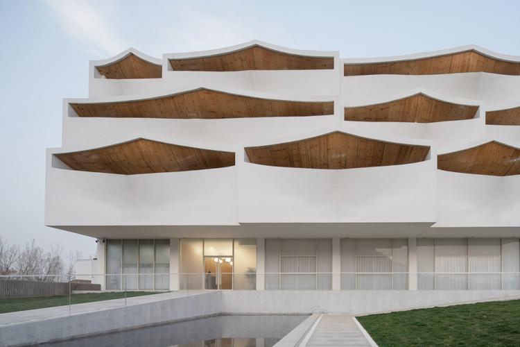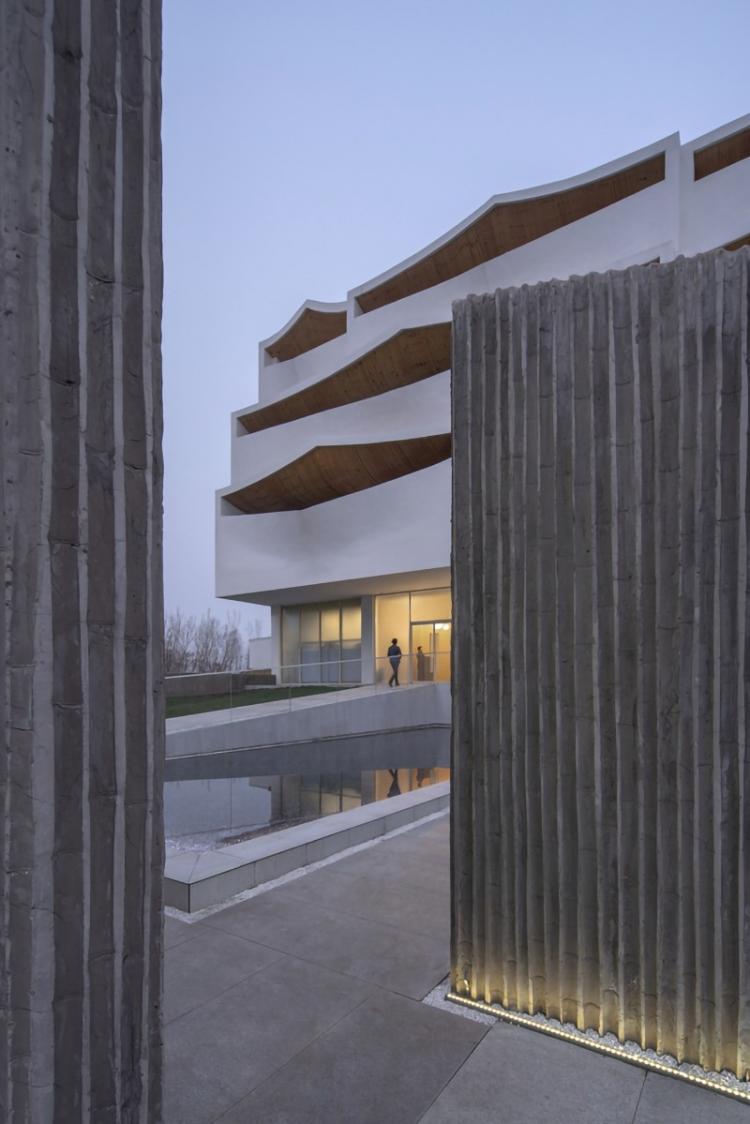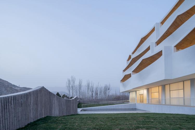 建筑前庭院的地面亦被“掀起”,像抽象的山形,与远处真实的云台山遥相呼应;同时通过将首层抬高半层,高效解决了复杂的人车流线,也实现了场地土方平衡。从首层室内向外望,磨砂玻璃包围中的透明开窗,将前庭和远山框在一起,又形成了动人的借景和框景。