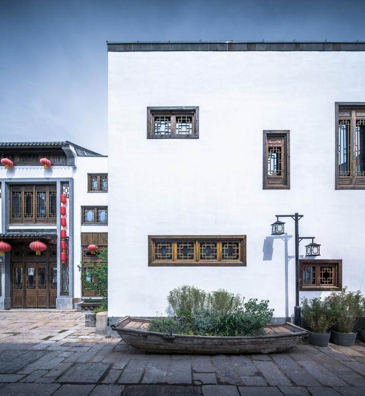 在延续传统营造方式的同时,给建筑注入时代性的表情,体现传统建筑在新时代语境下的自然生长,如:将现在立面与材料编制在传统立面语汇中,形成折中形态;传统花格窗的现代构成方式,形成既古非古的有趣玩味状态。
