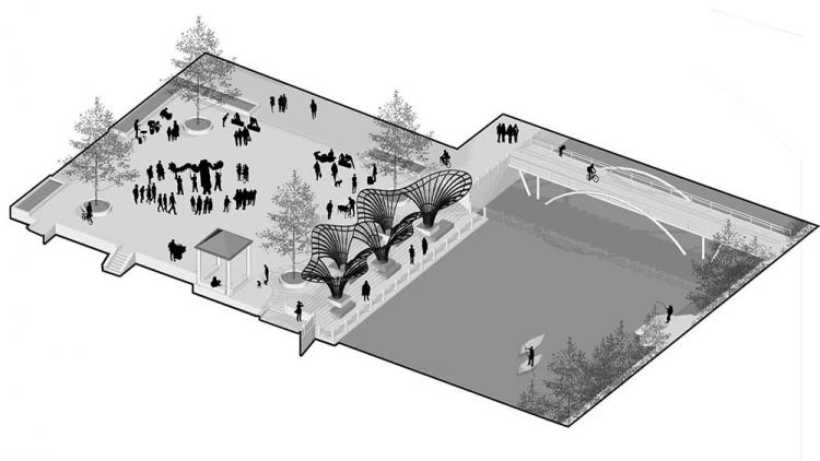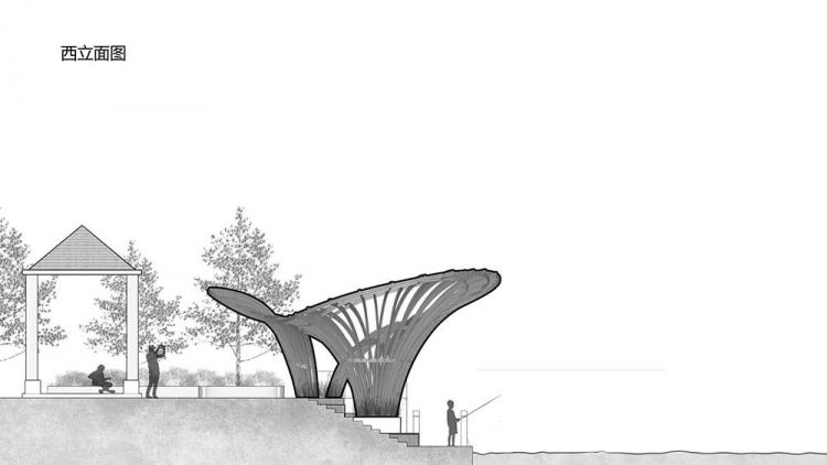 竹廊选址在黄龙村中心新建的鲤鱼沙公园,鲤鱼沙公园内虽拥有充足的广场空间与滨水景观,但缺乏茂盛乘凉的植物景观和遮阳避雨的休憩场所而人迹罕至、缺乏活力。在场地调研的过程中,我们发现公园内滨水的跌级台阶处经常有村民在这里钓鱼和活动,如果能够增加一片遮阴,应该能够将这里打造成一个很受村民和游客欢迎的的空间。于是我们选定了在滨水台阶处搭建一个滨水的竹廊,希望通过建构滨水的竹廊,给享受黄龙村水乡风情的居民与游客一个阴凉之所。滨水竹廊采用双边悬挑方式,利用原竹的韧性,实现结构表皮一体化设计。与台阶结合,提供最大化的滨水灰空间,该竹廊底下可承载多重活动功能,集休憩娱乐、观影水上剧场、码头等于一体,激活焕发黄龙村的新面貌。