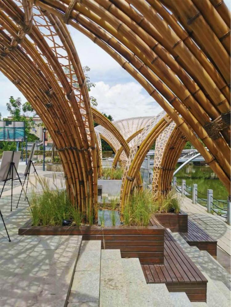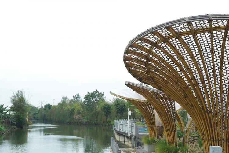 黄龙滨水竹廊2.0是长岐球场竹廊方案的延续,竹廊2.0再次尝试延续低碳自然的原竹材料的现代设计与建造,结合乡村传统竹编的手艺与美感,为滨水台阶提供一个悬挑无柱、视线通透、遮风挡雨、不影响活动的灰空间。