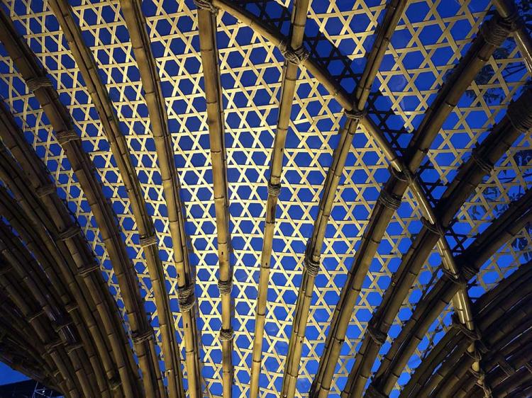 结合长岐村篮球场竹廊1.0的经验,我们优化了“结构表皮一体化”的结构选型,通过束柱的方式让原竹错缝拼接达到更长的悬挑长度,内部隐藏的钢骨架协同受力与协助找形,表面的竹片编织一方面为内部空间提供丰富的光影变化与遮阳环境,另一方面蒙皮效应增加整体“伞”状结构的稳定性与整体性,顶上还铺设透明防水胶片为结构与空间遮雨;从单边悬挑升级为受力更稳定的双边悬挑,模糊了黄龙滨水竹廊正反面的区分;通过结构优化,缩小竹柱直径,最大化悬挑深度,伞面直径达9.3米;