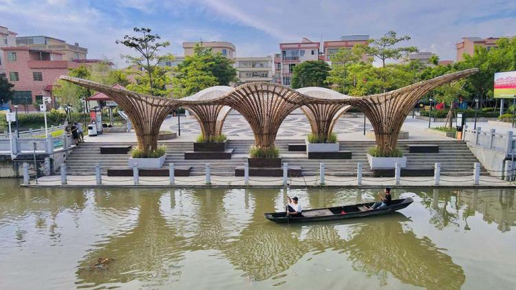 600年前的护龙桥静默不语,300年前的杜氏祠堂肃穆而立,黄龙村浓厚的历史质感穿过南安巷,与富临公园两座火红的雕塑交相辉映,历史与现实在这里巧妙交融。黄龙滨水竹廊2.0位于广东省佛山北滘镇黄龙古村。北滘,古称“百滘”,意为“百河交错、水网密集”。典型的岭南水乡内,滨水的灰空间气候适宜。在黄龙村,大大小小穿插在村子里的公共空间是黄龙村最具人气与场所魅力的活动场所。融合自然更成为居民们生活、闲聊与娱乐的亲水营地。
