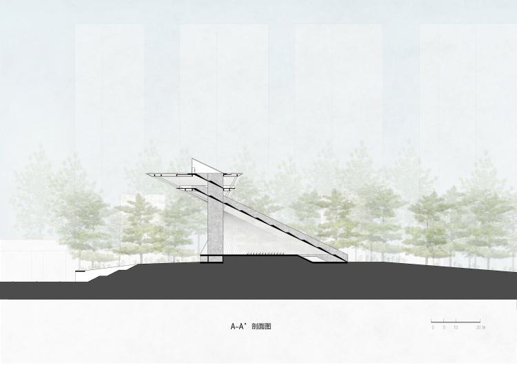 一段旅程串联起了“未来之塔”的各个部分。故事始于城市街道,浮于松林之上的“未来之塔”从远处便吸引人们的目光。人们带着期待来到被松树环抱的塔下。松林营造了自然、幽暗的环境,阳光在特定的时刻穿过瞭望塔,带来神圣的仪式感。一座“天梯”自地面架起,屋顶未知的景观吸引着人们拾级而上。登高带来的劳累将在抵达屋顶后得到释放,一滩浅水倒影了天空与远山,使人的心情慢慢归于平静。身体力行的旅程将为人们带来情感的升华。