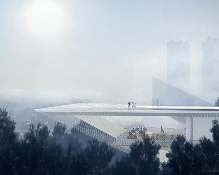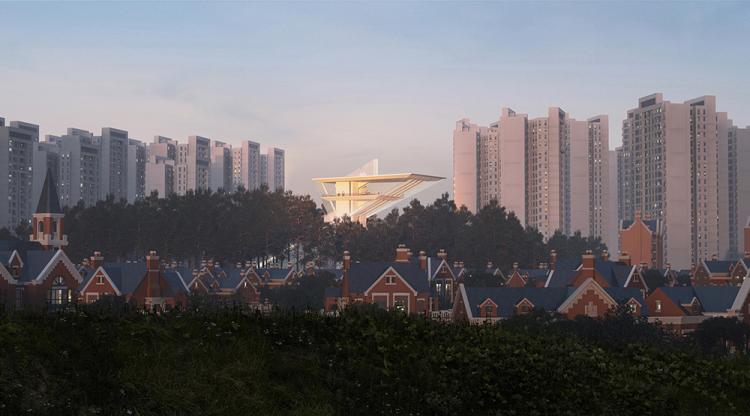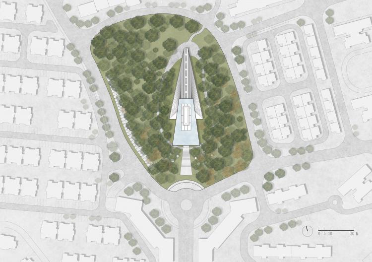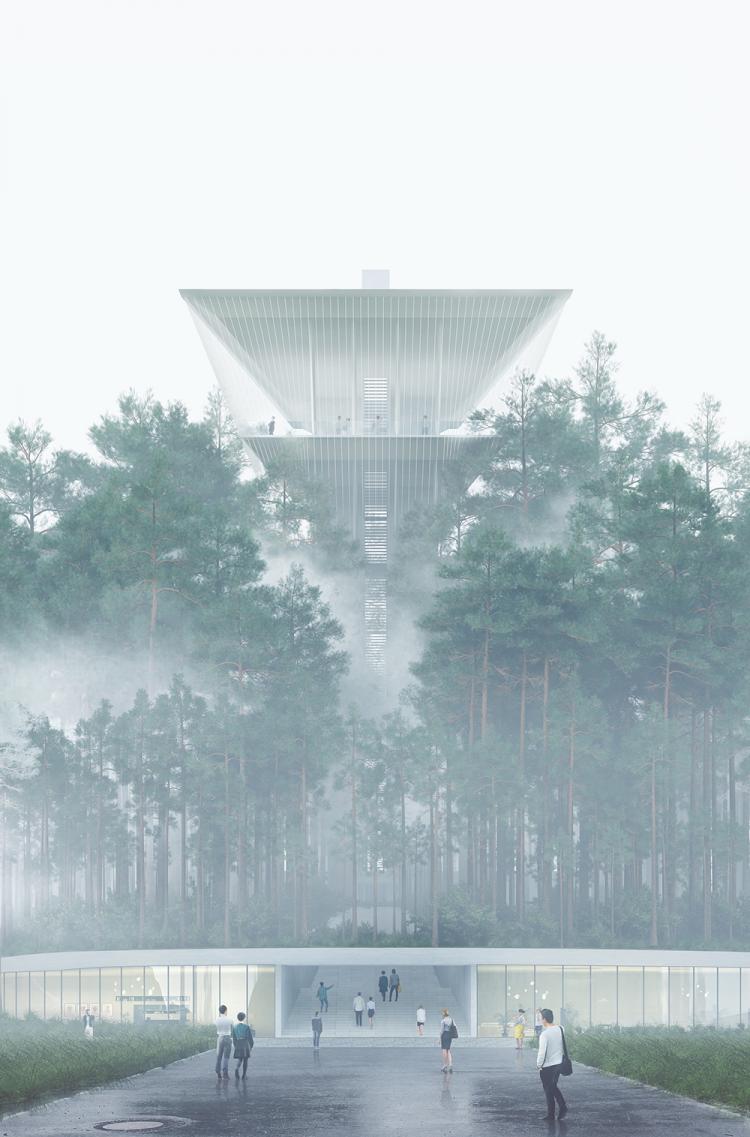 △从城市街道看向未来之塔,上半部分轻盈的体量浮于松林之上,下半部分隐于林中