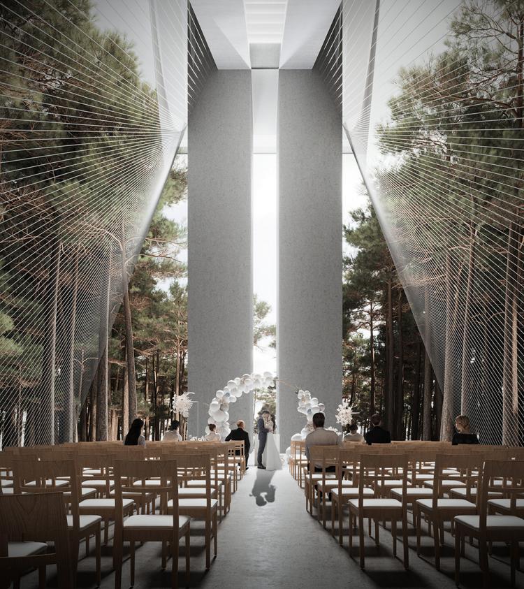 △下半部分被松林围绕,细钢索形成半通明的幕布效果,同时界定了内外空间
