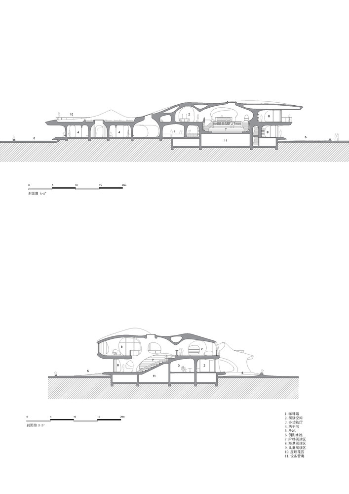 结构形态形成的多个半室外空间和平台,也是人们阅读和望海的绝佳空间。为适应当地炎热的气候条件,建筑外围的回廊灰空间采用了悬挑设计,通过物理遮阳降低热辐射,实现建筑节能。