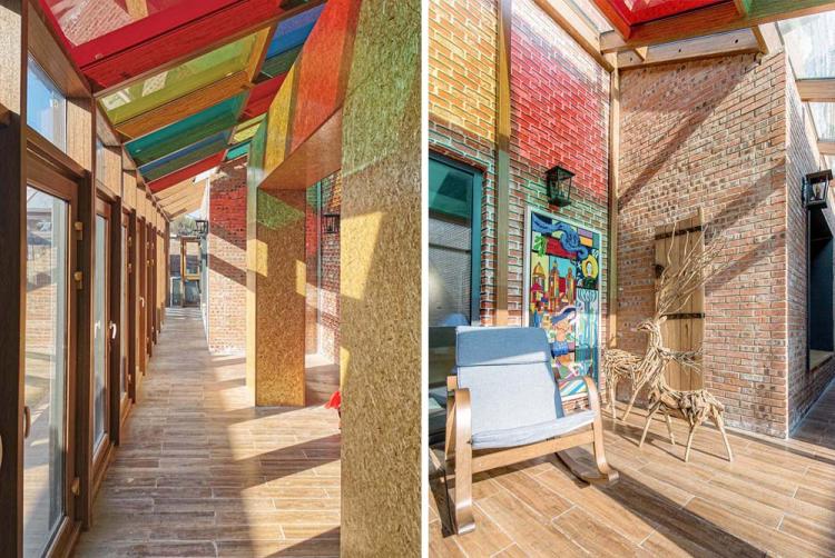 天友·零舍采用了可再生能源补给,屋面采用了传统民居双坡形式选择的非晶硅太阳能光伏瓦,不仅能为建筑提供自然转换的电能和热能,减少后期居住使用能耗,同时在太阳的照射下,形成波光粼粼的动态景象。阳光透过彩色薄膜光伏顶落在阳光房的墙面上,彩色的光晕将艺术氛围融入室内空间。
