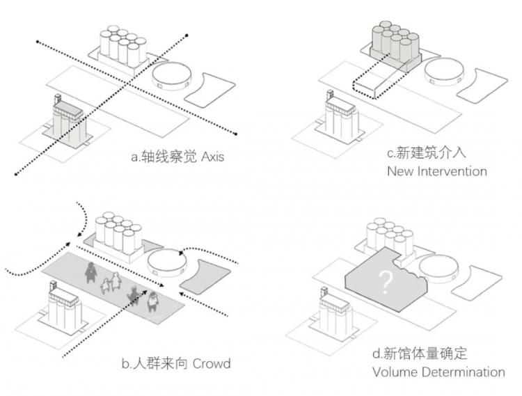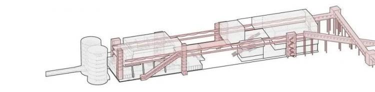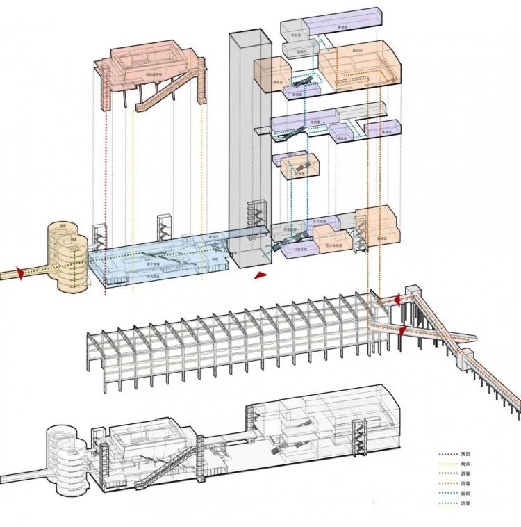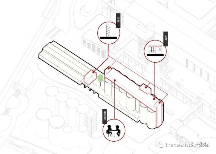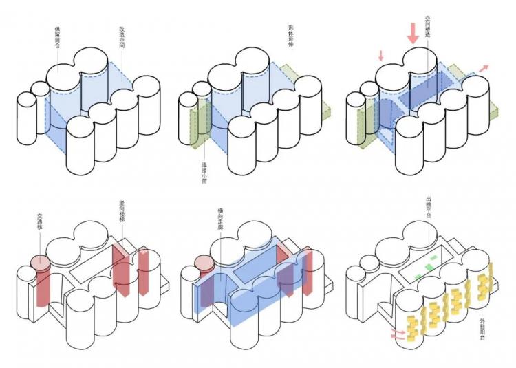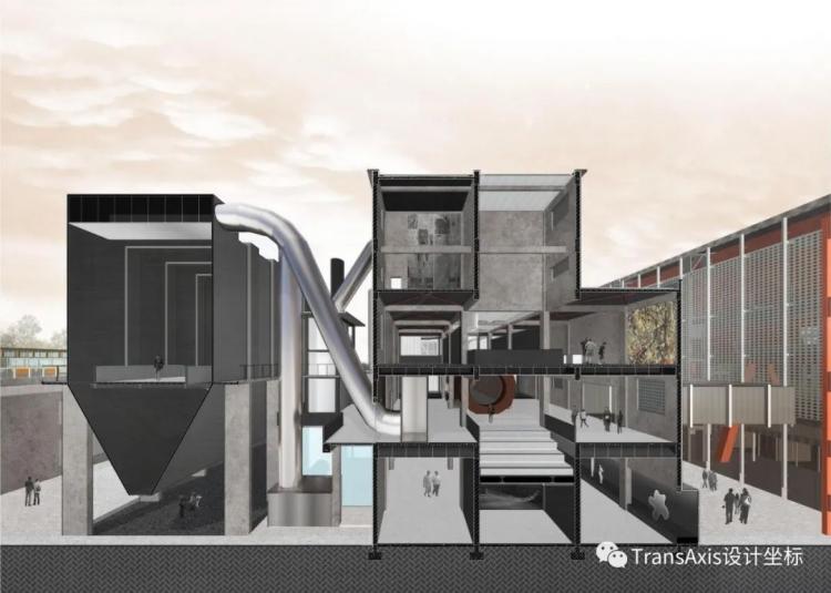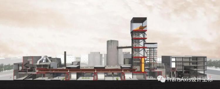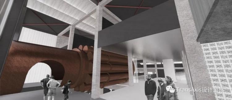 为了将造型各异的工业构筑物有机结合,新增和改造出来的部分展示空间和交通空间。