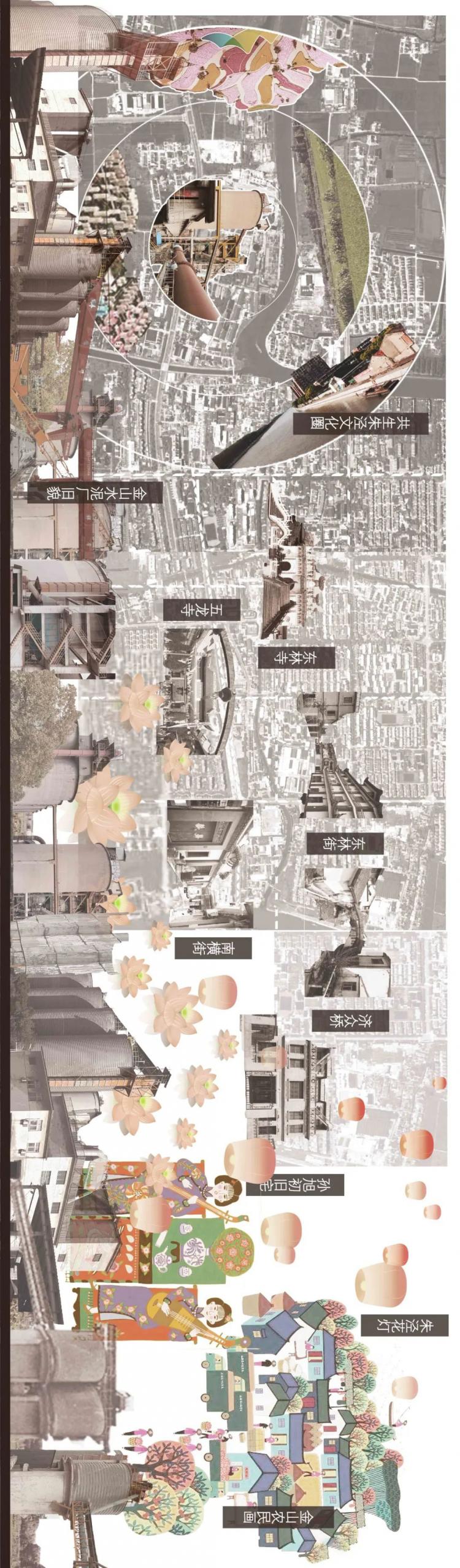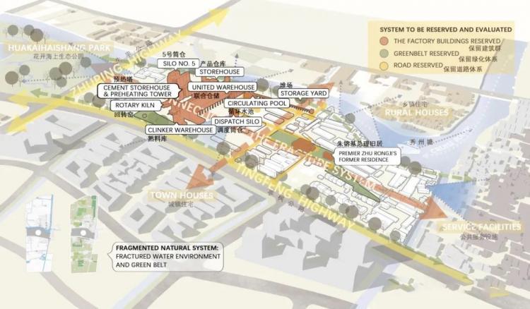 从镇区的及基地周边的视角看金山水泥厂,不仅在自然环境条件上,我们的水泥厂面临着南北迥异的生态环境,就连在人文环境与文化资源上,基地周边也显示出各方向强烈的碎片化拼贴感,这些碎片化问题主要来源于城镇风貌历史底蕴丰厚,但是文化个性模糊;而公园类景区各自独立且封闭,缺少联系镇区的开放空间;生态绿地缺乏整合联通,水网体系断裂且没有文化共鸣。