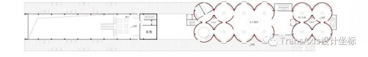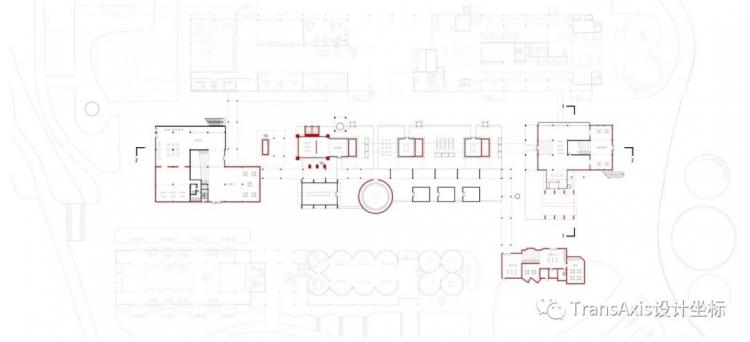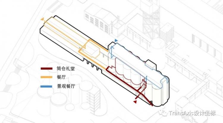 从平面可以清晰地看到北部餐厅与南部筒仓礼堂之间的连接关系。