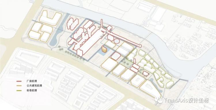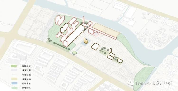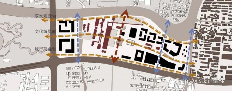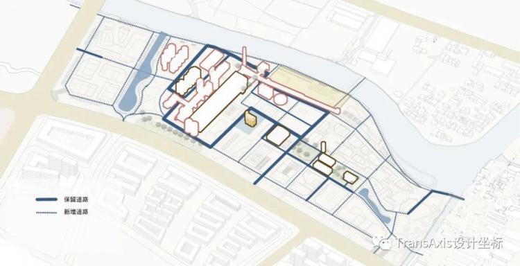 一条自东向西的文化轴线和一条自南向北的主入口轴线从基地正中心蔓延开来,这就是最早的策略。这个新植入的“十字轴”,和被保留的轴线形成了拆分基地为不同功能区的网格体系。而被新置入的河岸景观商业区与遗址公园区,被轴线串联起来。