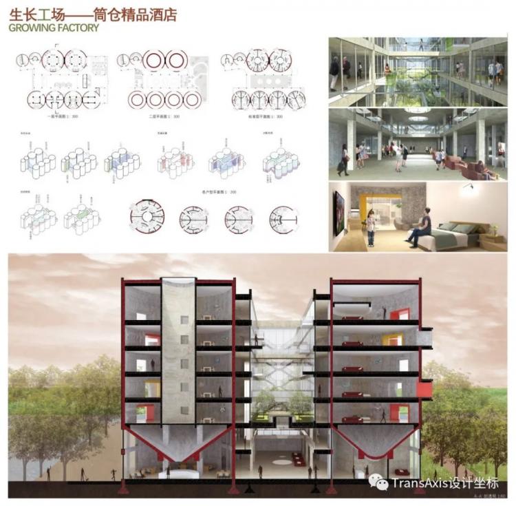 近几年,民宿作为一种全新的旅游居住模式,因为其颇具地方特色的建筑风格和小众品味成为了游客“打卡”的新目标。民宿作为一种特色居住空间也成为了建筑改造的一个新的主流方向。而传统的酒店行业也受到“民宿风”影响,在建筑外观和内部居住空间特色上也开始疯狂发力。作为整个工业遗址公园最西面的五号筒仓,因为单独的同体之间间距较远,适合连接之后作为整体使用,俞婕同学选择将这一景观良好且颇具特色的筒体建筑改造为特色筒仓酒店。