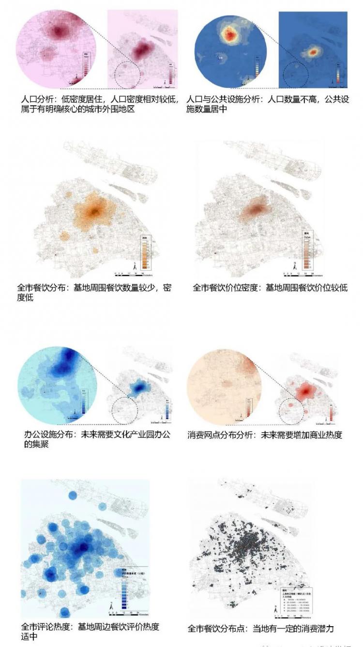 在寒假期间,我们已经以12人单位开始了基地的基本信息调研。感谢助教学姐提供的POI数据、大众点评数据和上海OSM路网设计,让我们得以有机会第一次尝试利用GIS的方式做基地分析,更加有依据更精确地锁定基地现存的功能缺失,为后期的城市设计功能分布做出了足够的铺垫。甲方老师们还详尽地为我们提供了现状部分照片以及周边状况照片;金山县的历史资料(甚至追述到清朝期间的历史);落照湾北部核心区功能定位综合报告等资料,让我们脱离实地的前期工作变得顺畅了不少。对题目的整体方向把控也逐渐变得清晰。