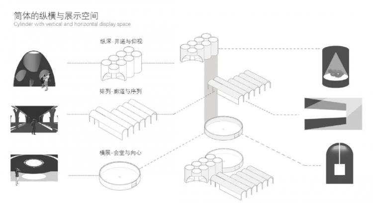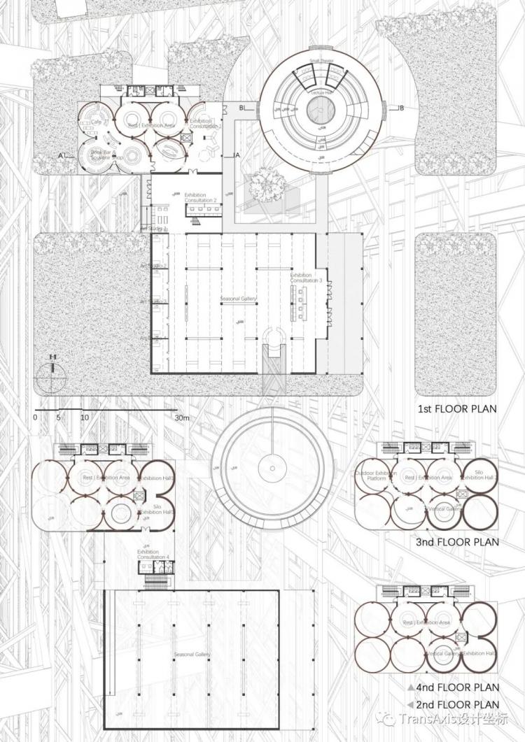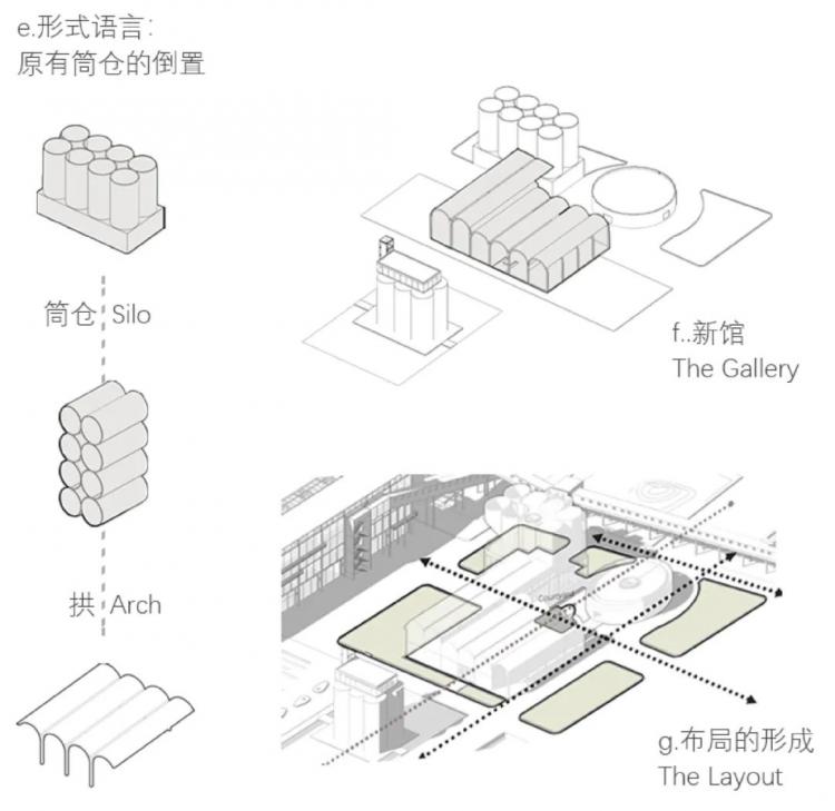 于是,美术馆“三件套”——筒仓改造的展览馆,新馆季度画廊和蓄水池改造的会堂格局就此形成,接下来就是三个建筑空间氛围的塑造和平剖面细节。