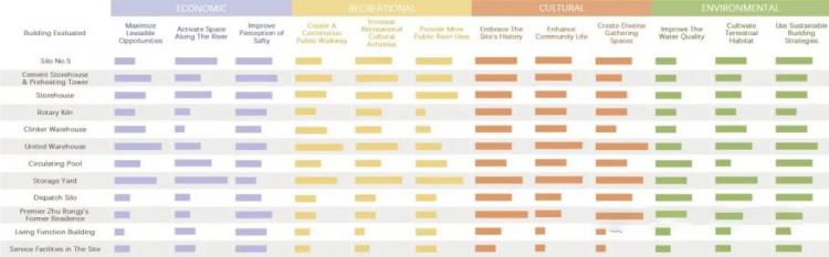 下表为我们针对基地内建筑群按功能分类进行价值评定的表格,我们评定的建筑为:五号筒仓、预热塔、成品仓储、回转窑、熟料库、联合仓储、循环水池、堆场、调度筒仓、总理旧居、生活功能建筑群和服务功能设施共计12种待评定建筑群。而针对它们的评定标准有就业机会、河岸空间、安全性能、公共走廊、娱乐活动设施、历史文化延续、水质提升、新居空间营造等共计12种评定指标。
